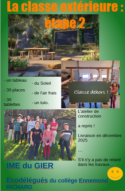 Les écodélégués et les élèves de l'IME du GIER réalisent des lieux de classes extérieures. Les ateliers de fabrication du mobilier reprennent et vous pourrez bientôt les utiliser.